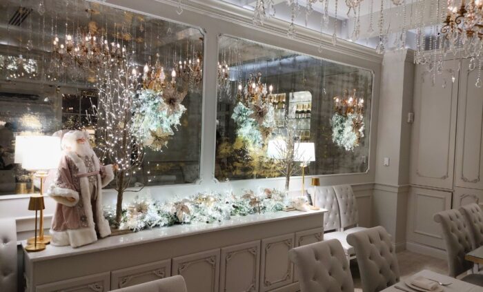 Pictures cannot do justice to the princess tea party dream wedding energy that oozes from every square inch of the decor. There is garland with lights sparkling in the twinkly tinsel, and padded chairs that could be in a royal family’s dining room (maybe), and lots and lots of white, but all different shades to keep it from getting boring. The decor changes with the season; the picture above was shortly after the switch to autumn, and the one below is from winter.