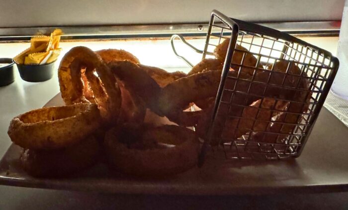 Lightly battered and crunchy, with a tender, sweet ring of onion inside that was cooked all the way through. Top-quality onion rings that totally suit the drive-in scene. If you love the ones from the 50s Prime Time Cafe, we ate those two days beforehand and would swear these are the same rings.
