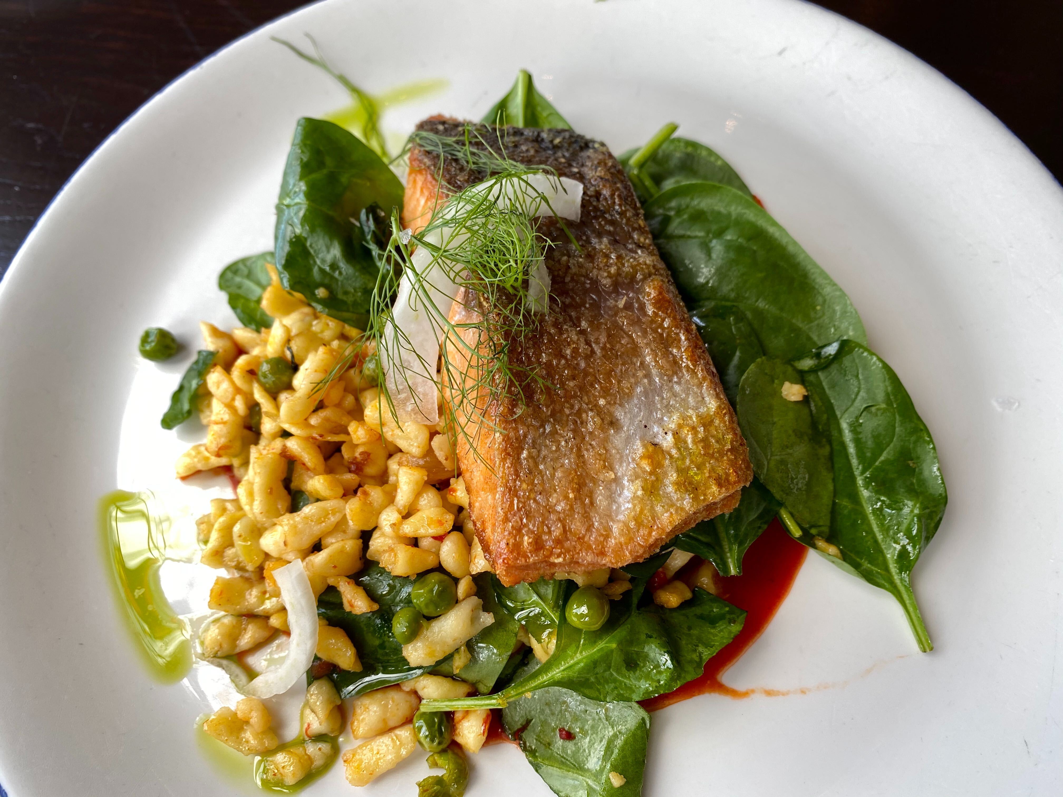Check out the menu here. You can choose between the Soup of the Day, Charcuterie Plate, and the Castle Salad to start off your royal meal. We asked our Instagram followers to choose our appetizers. The Charcuterie Plate is a Chef’s selection of cured meats, pickles, and accompaniments. The portion was a little small, but each piece on the plate was quality; the spicy mustard and the pickles pack a punch. The Castle Salad is composed of hearty mixed greens, toasted pumpkin seeds, Riesling-marinated golden raisins, pink lady apples, and maple-balsamic vinaigrette. This salad was a hit with our team–well composed and satisfying.