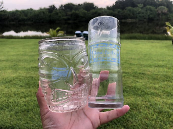 Among the various pieces of Royal Pacific Resort-branded merchandise is this glassware. One is shaped like a bamboo stalk and the other is a tiki.