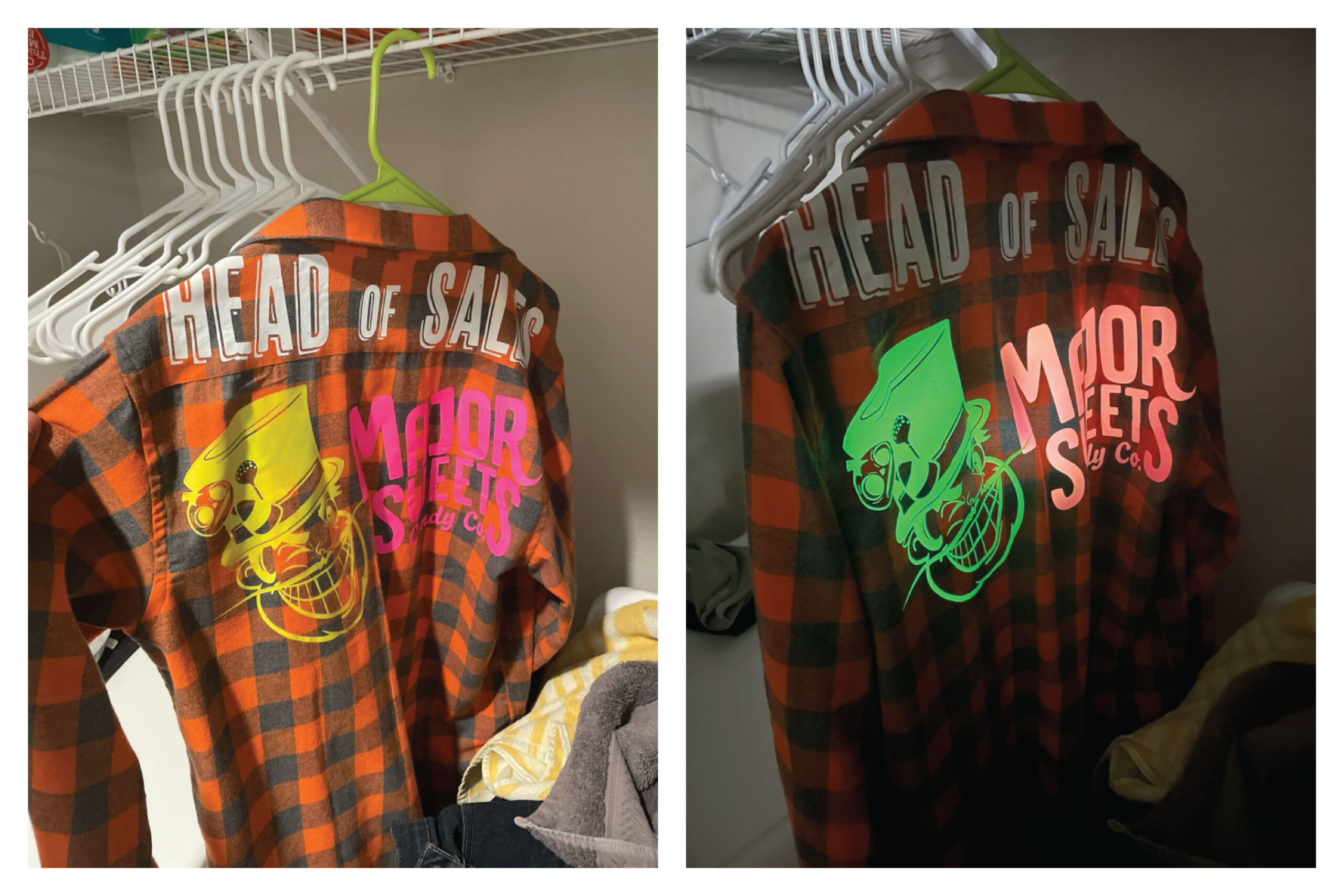 One tradition I’ve kept since around 2021 is creating custom flannels (and occasionally shirts) for Halloween Horror Nights. Every year, I design something new based on that season’s event. A signature element I love incorporating? Glow-in-the-dark details. I try to get more creative with it each year. Keyword: try.