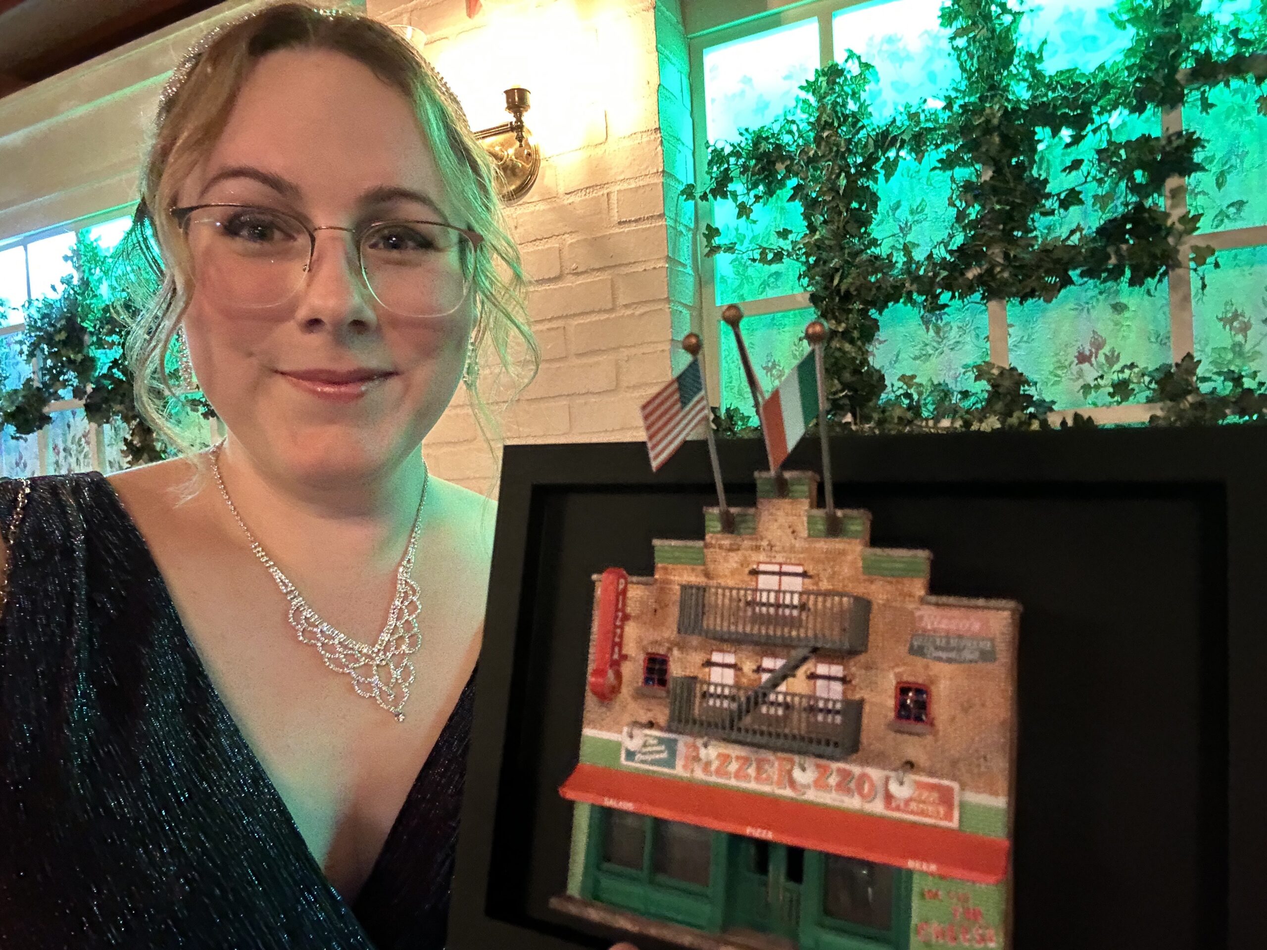 I have a framed award declaring me PizzeRizzo’s Biggest Fan on my wall, a gift from the PizzeRizzo Prom Committee. I have the photo from our last supper on my shelf next to a plush Rizzo doll. I have a scale model of the façade for PizzeRizzo on my desk, lovingly crafted by Cremated Plastic, (which really lights up)!