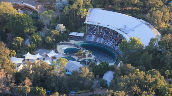 A more direct view straight down of the Dolphin Theater gives a better look at the nearby areas for dolphins and manatees.