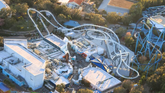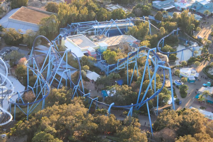 This stunning shot below features four of SeaWorld’s coasters including (from back to front) Mako, Kraken, Penguin Trek, and Manta.