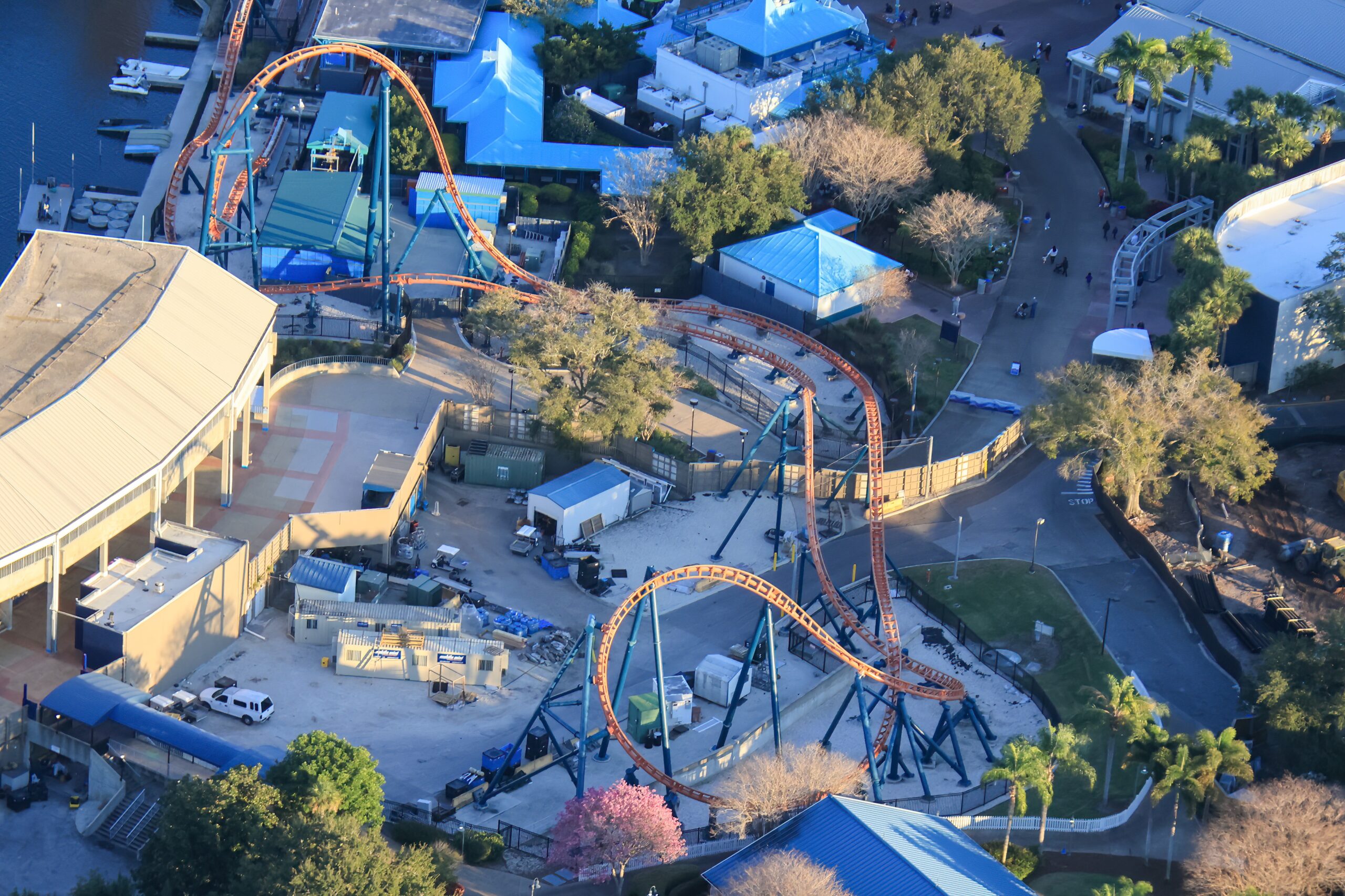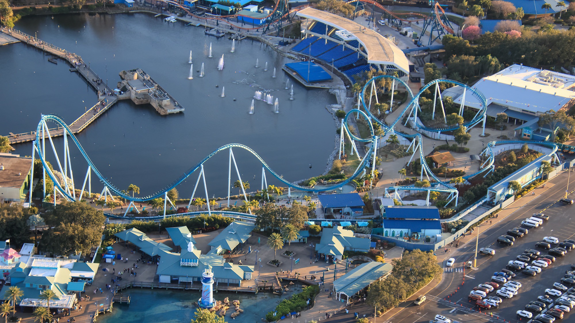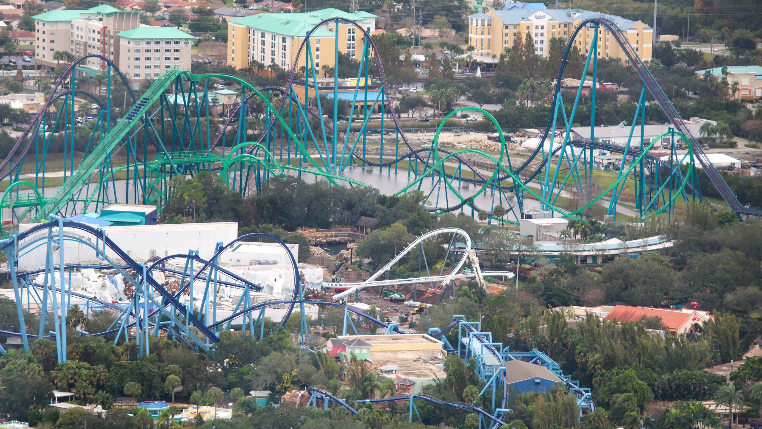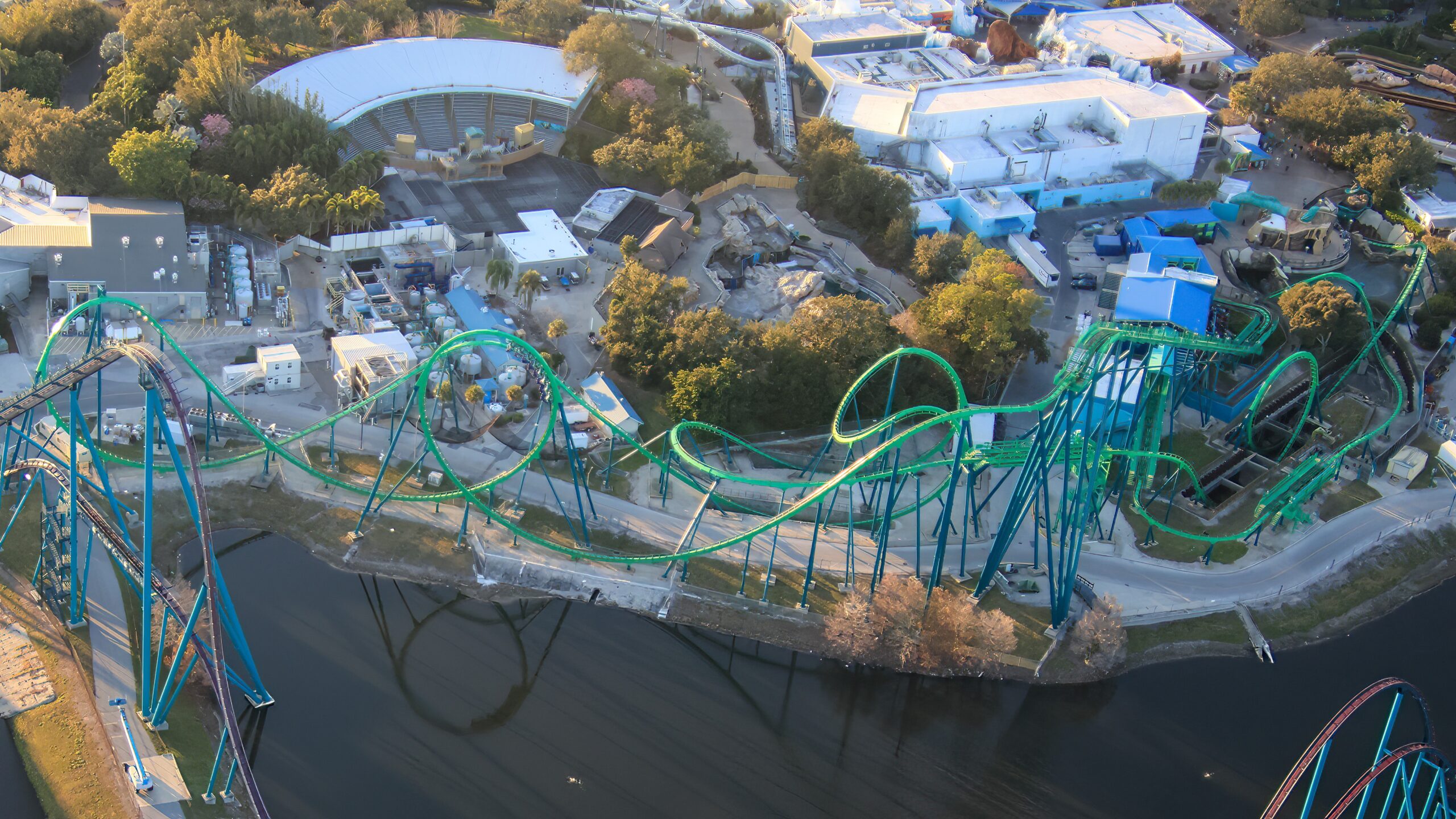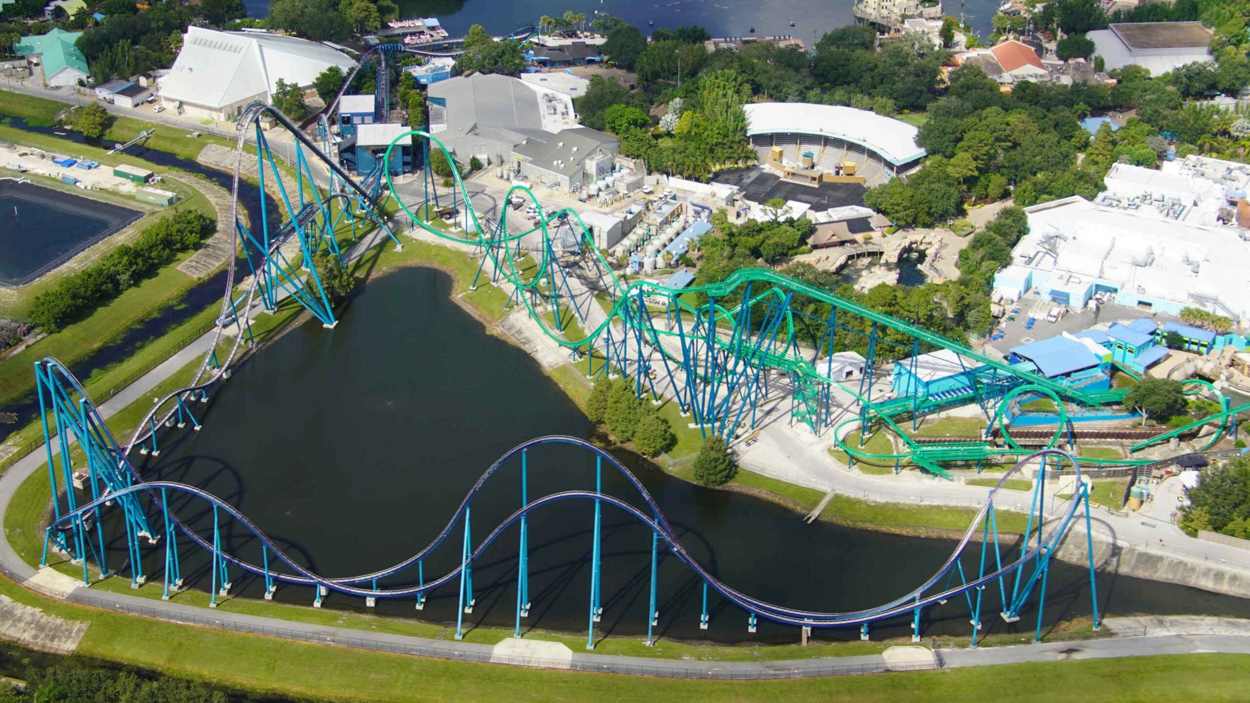 This stunning shot below features four of SeaWorld’s coasters including (from back to front) Mako, Kraken, Penguin Trek, and Manta.