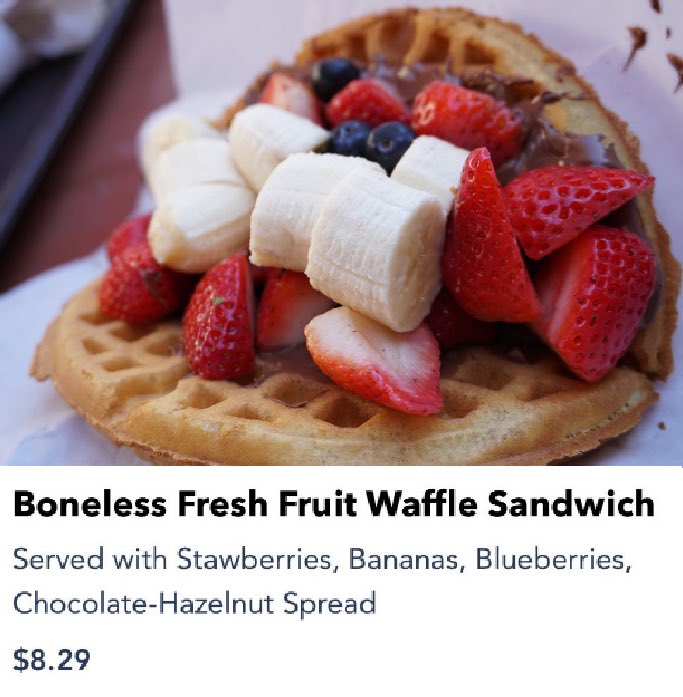 In early 2021, Schmoofy posted online that Disney had advertised a Boneless Fresh Fruit Waffle Sandwich for Sleepy Hollow in the Magic Kingdom. This was the exact type of item that gets immediately inducted into the Theme Park Food Hall of Shame and I earmarked the story for the end of year Turkey Awards as well.
