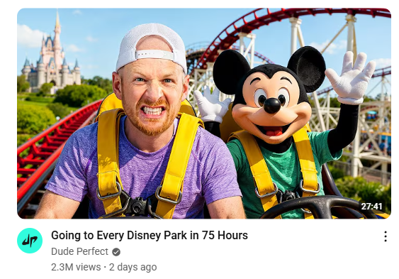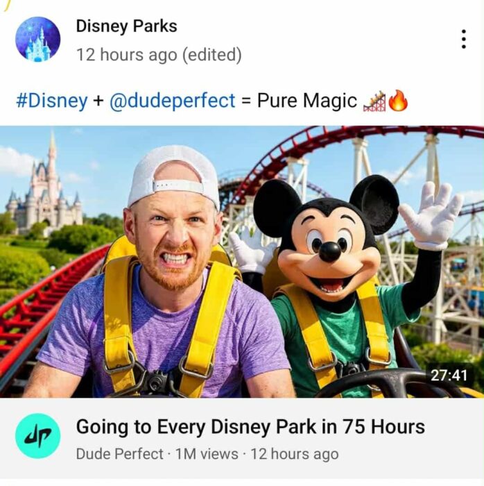 The post above was shared by Disney themselves and features a member of Dude Perfect and Mickey Mouse on a roller coaster (that doesn’t exist in a Disney park) and Mickey is showing TEETH. It’s bad enough that the multi-million dollar enterprise that is Dude Perfect relied on AI slop for this image, BUT DISNEY SHARING IT?!!