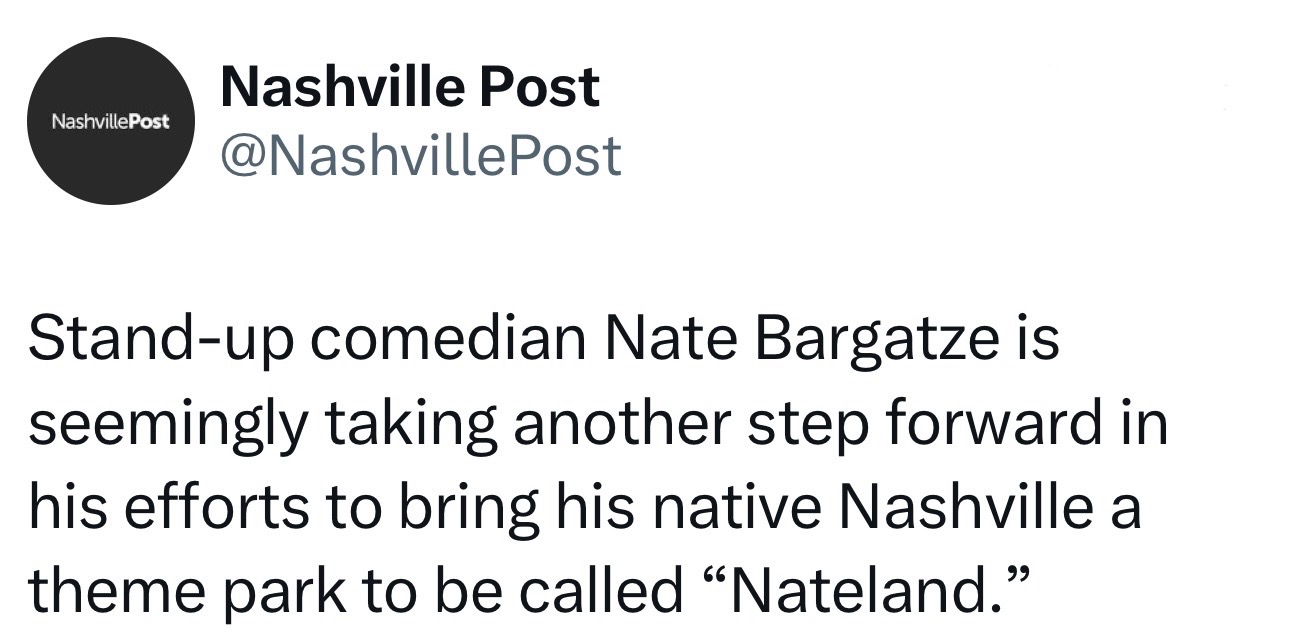 I love comedian Nate Bartgatze as much as anyone and his skit playing George Washington on SNL was one of the funniest things I’ve seen this decade (and the follow-up skit was also hilarious.) But a Nate Bargatze theme park? MULTIPLE parks across the country? Seeing stuff like that makes a siren go off, and no, it’s not a good siren.