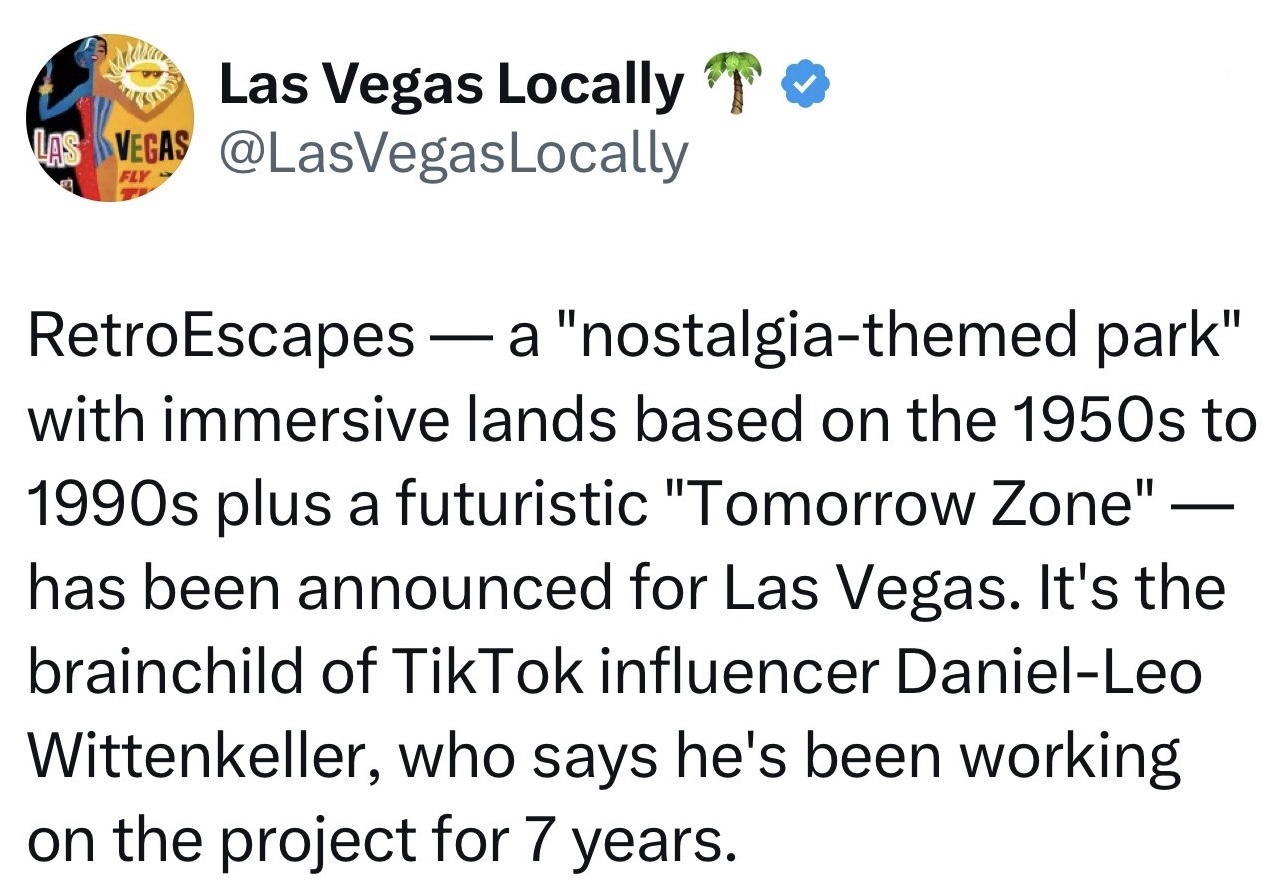 Here’s what could be the biggest problem of all this nonsense… for most of these parks they are being announced before even the most minor of due diligence for an actual business plan has been done. The retro-park in Vegas that they’ve been “working on” for 7 years? They don’t have the land to put it on or even the rights to the intellectual property they want to use. Nateland is only now just starting a feasibility study, let alone actually having the land for a park or the Billions of dollars needed to build the attractions.