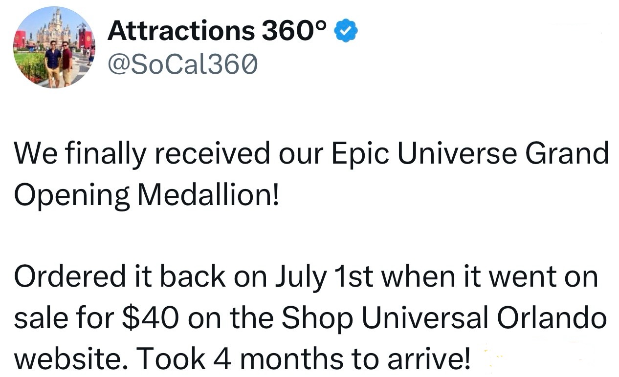Like many, we were at the Grand Opening of Epic Universe and were shut out of the medallions. However we did order one in June and it looked gorgeous when it arrived.