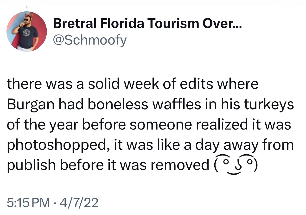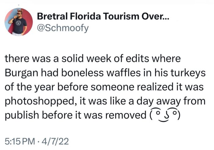 The night before the 2021 Turkeys went to print, I got a message from an anonymous source who informed me that “Boneless Waffle” was not real. It was something that Schmoofy had created earlier in the year in some sort of Long Con to slip something into the Turkeys.