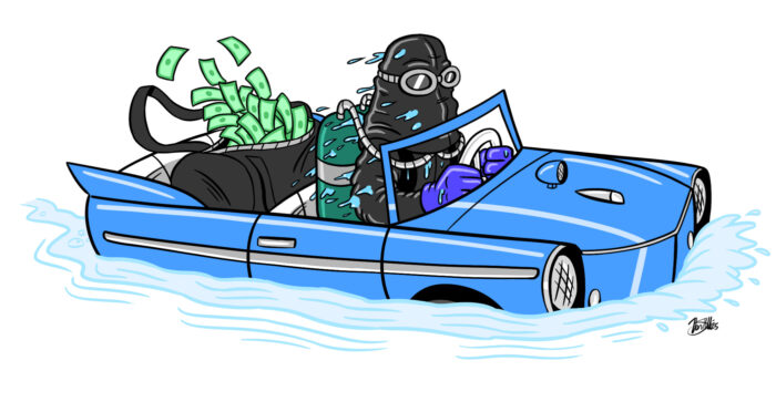The thief – dressed fully like a Dollar Store Superhero Villain -allegedly placed trash bags over heads of two employees, taped their hands, and then ordered them to get on the ground and close their eyes. Initial reports claimed that the suspect swam up to Paddlefish, stole the cash, and then swam away. However, the police report of the incident does not mention this.