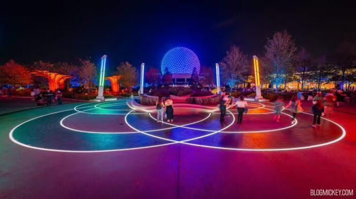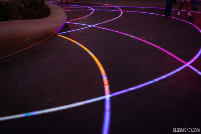 Now, one of the neat things we did get with the EPCOT overhaul was a lighting package on the ground that is designed to resemble the classic 5 ring EPCOT Center logo. This looked spectacular from the air. These lights made their official debut in December, 2023.