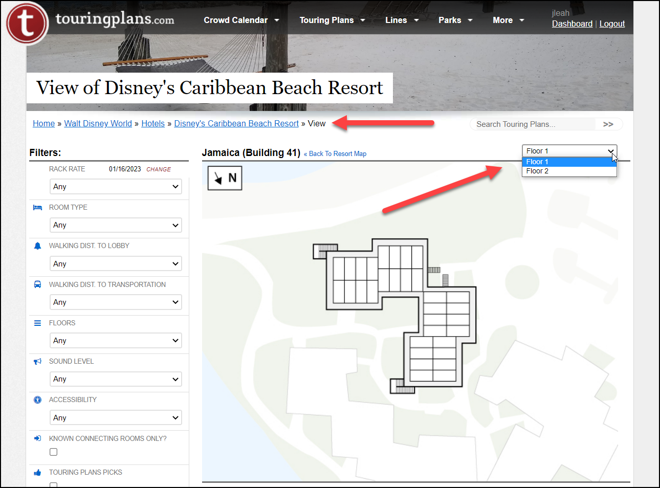 If you’re on a computer and you mouse over a single room, you can see the room number and orientation. The building may have been turned from its orientation on the resort-level screen to give you the best view. At the bottom of the screen is a dropdown to change floors, and at the top, to the right of the building name, is a link to go back to the full resort map.