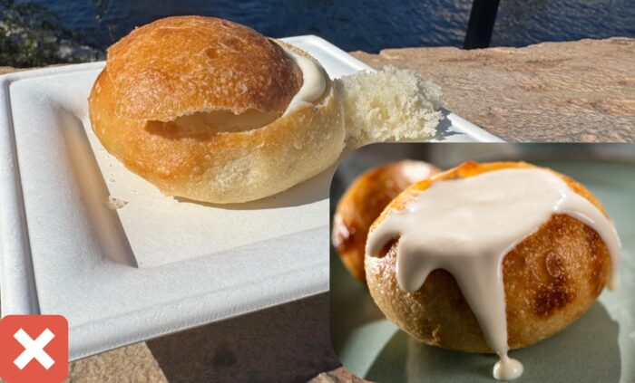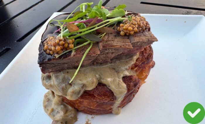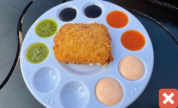 Crème de Brie en Petit Pain, $9.95 in 2025 and $10.25 in 2026 – As a self-proclaimed Fromage Ami of my local cheesemonger, I’m not against high prices for excellent cheese. This is not that. The picture on the right in the frame above is the image shared by Disney in promotion of Festival of the Arts. The picture on the left is what I was served at last year’s festival. The bread was not worthy of any cheese and the brie inside wasn’t fully melted. I would have been just fine with the diminutive size had the taste, texture, and presentation been stellar. This is way too much money for a Costco roll and a hunk of half melted cheese. Skip.