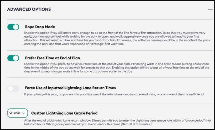 Have you heard of the 119 minute “grace period” for Lightning Lanes? This feature is currently only accessible under Advanced Options for Plans created on our website, but the same functionality is coming to our app. The Lines app will receive an update that will allow users to set custom Lightning Lane Grace Periods in a Touring Plan. You can read all about this new feature here.
