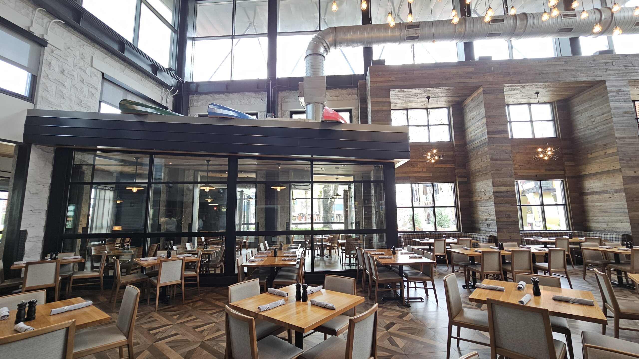 The overall theme of Bigfire is that of a “lakeside lodge,” so you’re going to see a lot of woodwork throughout the restaurant along with elements that tie into a lakeside vacation.