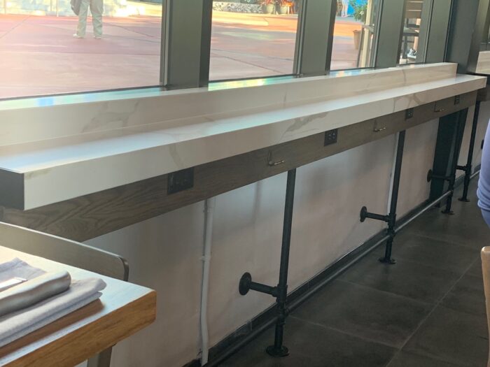 Reservations are certainly encouraged (which you can make through the Universal Orlando website or by calling 407-224-3663.) You can always try walk up, and there is also a first-come, first-served bar area which also offers the full food menu. This area below is directly across from the bar where you can wait for a seat to open up and includes outlets for charging your devices as well as hooks to hang bags.