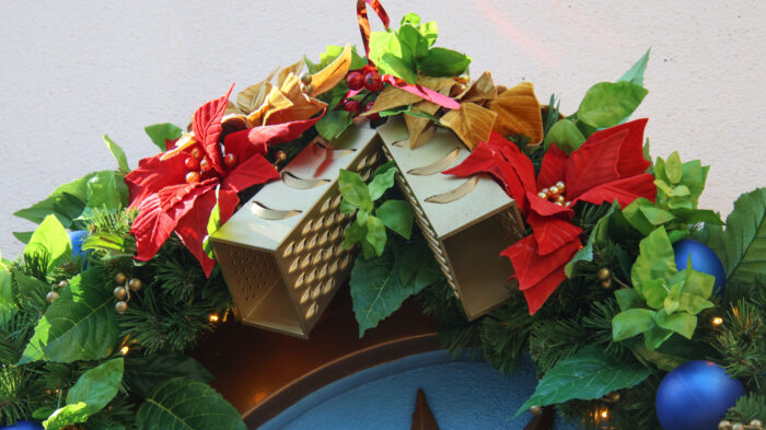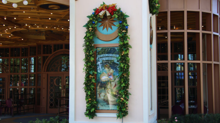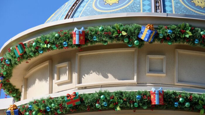 Right as you are approaching Epic Universe you are going to see Christmas decorations pretty much everywhere you look. From the bathrooms outside the front entrance, to the Chronos Portal itself and everywhere in between. I’m personally in love with the giant wreaths in this area and would love a small scale version for my house.