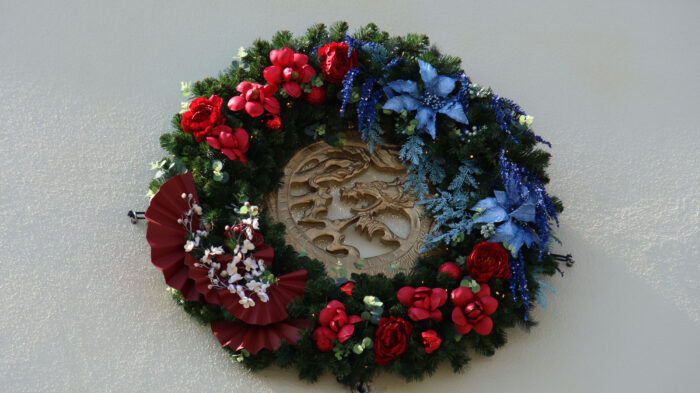 The wreaths and garland found in and around The Blue Dragon feature the restaurants blue and red color scheme.
