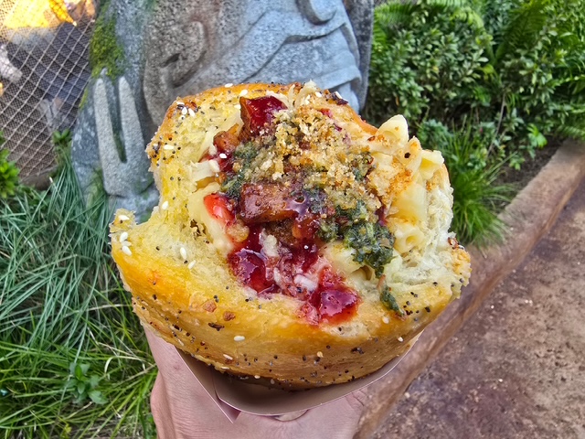 Snoggletog Harvest – creamy mac & cheese cone with pulled maple glazed turkey, spiced lingonberry drizzle, roasted sweet potatoes, sage chimichurri, and crispy stuffing crumbles.
