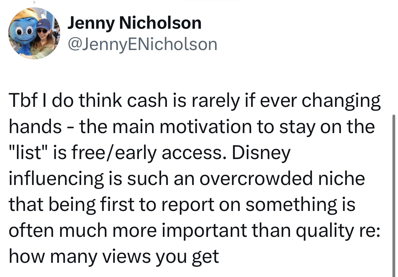 You may remember Jenny Nicholson’s from last year’s Theme Park Turkey of the Year Awards, where we talked about her AMAZING 4 hour YouTube video talking about the Rise & Fall of Disney’s Galactic Starcruiser (which was recently nominated for a Hugo award!) This month Jenny brought up an important topic when discussing Disney influencers…