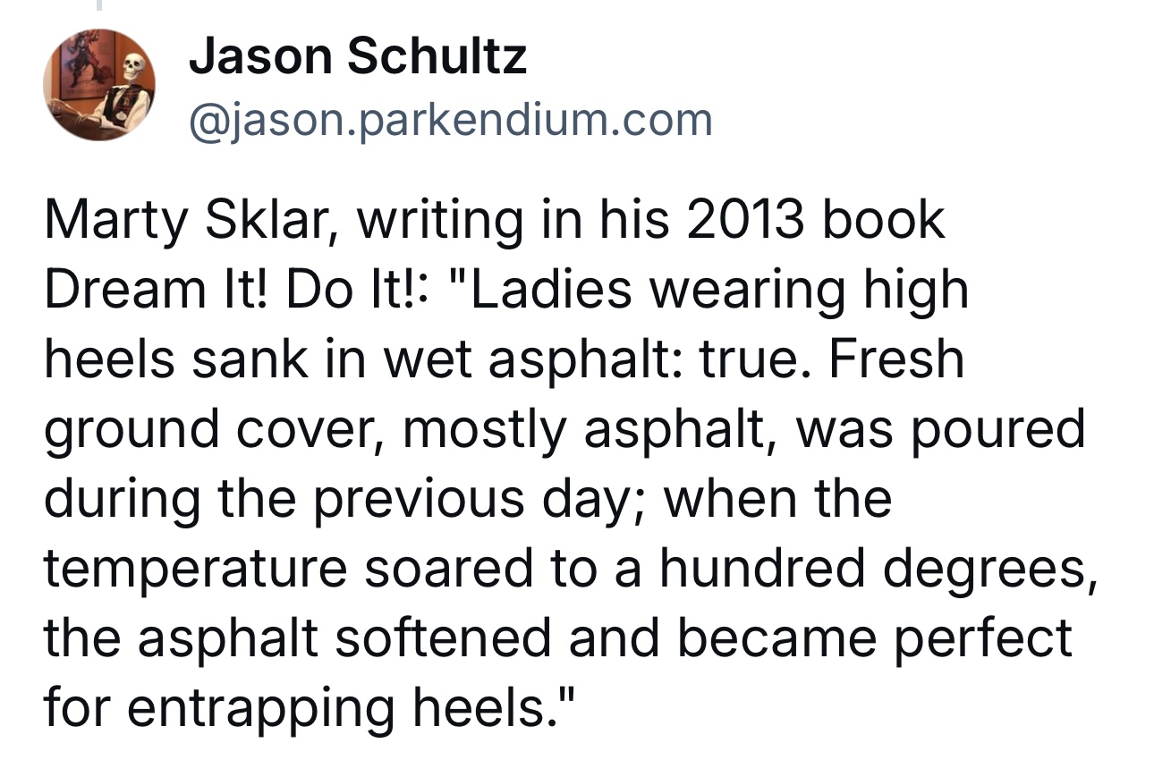 For many years, both in books, podcasts, and documentaries, I have heard the stories of how Disneyland was so rushed into production that on opening day the heels of women’s shoes were being stuck in the pavement. I’ve heard this story so many times I just assumed it had to be true. Well, over on the bluesky social media site, we got a better look at this Rumor and Innuendo…
