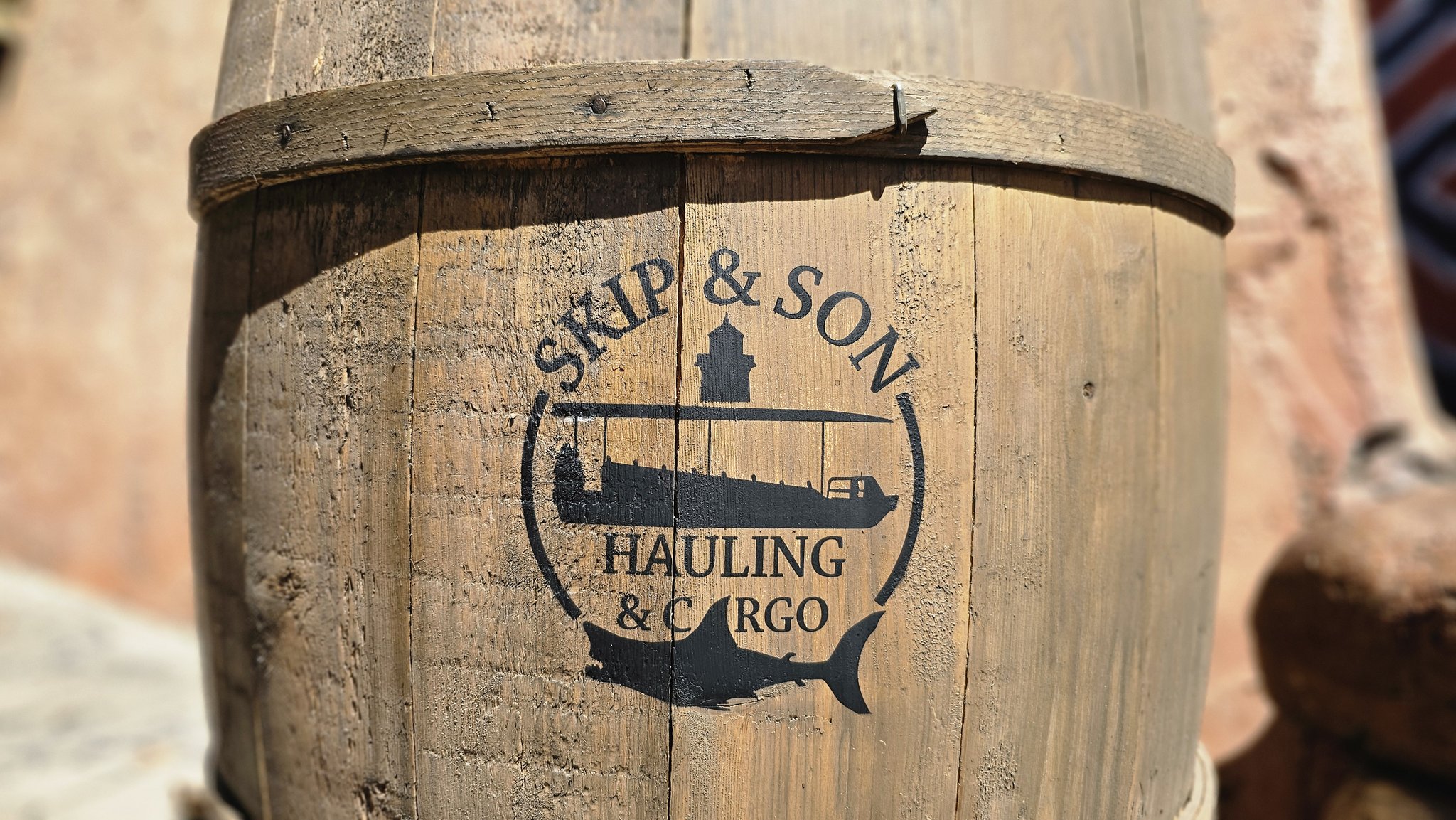 The barrel is branded with a “Skip & Son Hauling & Cargo” logo.