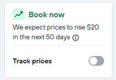 As you can see Kayak is advising me to buy the tickets now because their analytics say the price will go up in the next 50 days. Kayak bases their prediction on analysis of historical price changes, and they have a good reputation.