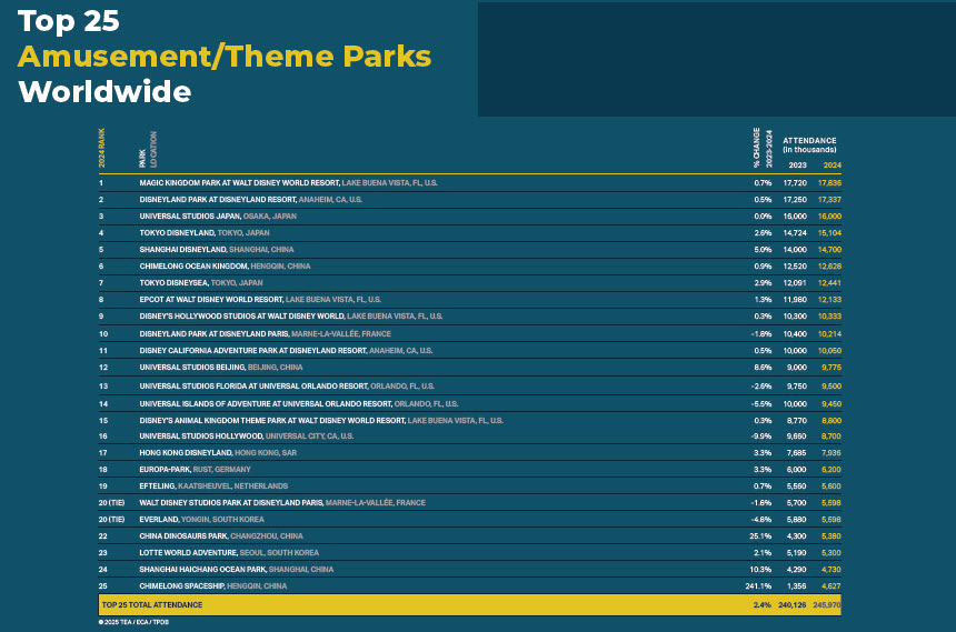 The 2024 Themed Entertainment Association (TEA) annual report on park attendance is out, and Magic Kingdom tops the list worldwide, with Disneyland in second place. Parks in Japan and China, including Universal Studios Japan and Disney parks in Tokyo and Shanghai, sit in the #3-7 spots, with two more Disney World parks and Disneyland Paris rounding out the top 10. Universal Studios Florida and Islands of Adventure are in positions 13 and 14. The full list of the top 25 worldwide is below.