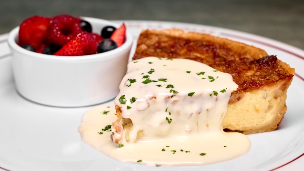 - Quiche Lorraine (Café L’air De La Sirène) – my mother convinced me to try quiche by calling it “bacon, egg, and cheese biscuit pie”. It worked. Pie crust filled with bacon, gruyère cheese, and caramelized onions topped with a mornay sauce served with a side of fresh berries topped with a lavender honey drizzle.