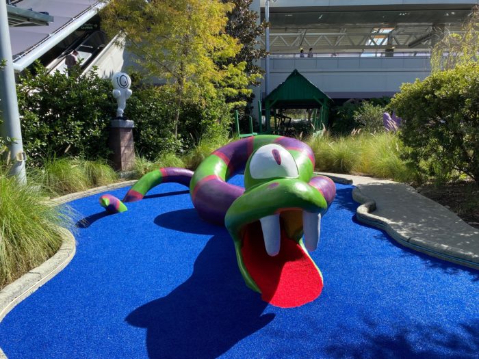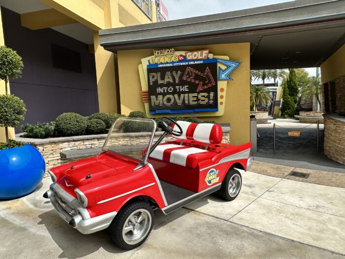 Hollywood Drive-In Golf is a miniature golf (i.e. putt-putt) facility at Universal Orlando’s CityWalk. Located between the Universal Cinemark theater and parking garages, Drive-In features two 18-hole courses themed to cheesy 50s sci-fi and horror movies. The holes are sandwiched between CityWalk and Universal Boulevard, so don’t expect large water features or sprawling holes like the mini golf locations on I-Drive. We still find the holes are filled with whimsy and fun, and are worth your time.