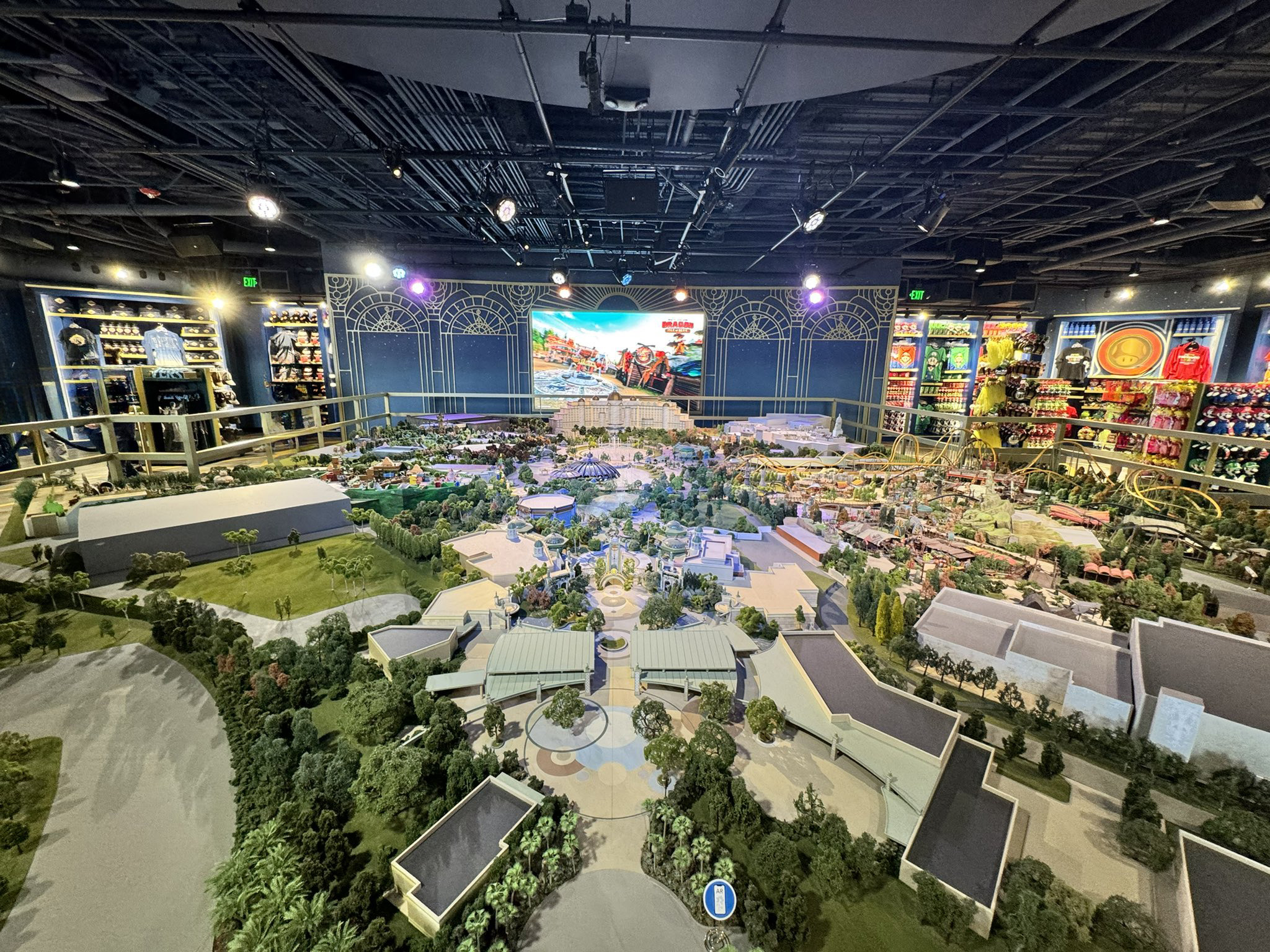 Replacing the long-in-the-tooth Universal Legacy Store, the Epic Universe Preview Center is a shop advertising their new theme park opening in 2025. The theme park model is the star of the exhibit and is full of dozens of fun, tiny details. View the model through a custom Epic Universe app for iOS and Android acts and see animated overlays over the model as you explore.