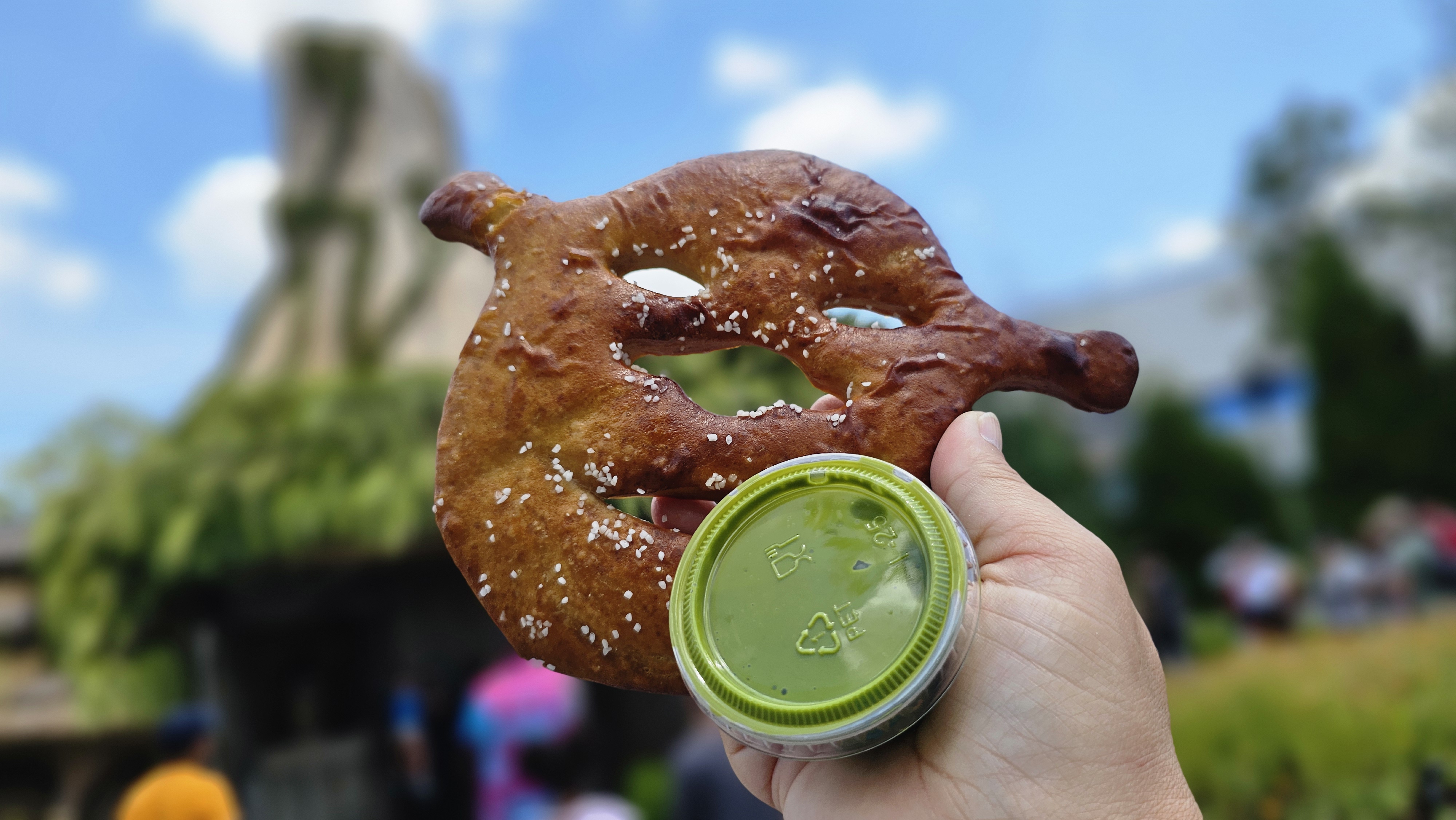 There are three new dining locations in DreamWorks Land. ⭐️ Imagination Cafe serves beignets and pizza and is located next to Spongebob Storepants by the land’s entrance. ⭐️ Swap Snacks at the front left when entering the land serve up Shrek-ified treats like the Shrekzel (pictured below), something called a “swamp dog”, and stuffed savory waffles. ⭐️ Trolls Treats by the entrance to the Trollercoaster has soft serve ice cream in funky flavors.