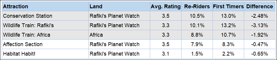 Looking at these numbers might hint at the reason that Rafiki’s Planet Watch was given seasonal status in the winter of 2018. Strangely, it appears that more guests in each group rode the train back to Africa than took it out to the Planet Watch to begin with. This lends credence to the idea that perhaps some respondents are not rating absolutely every attraction they experienced.