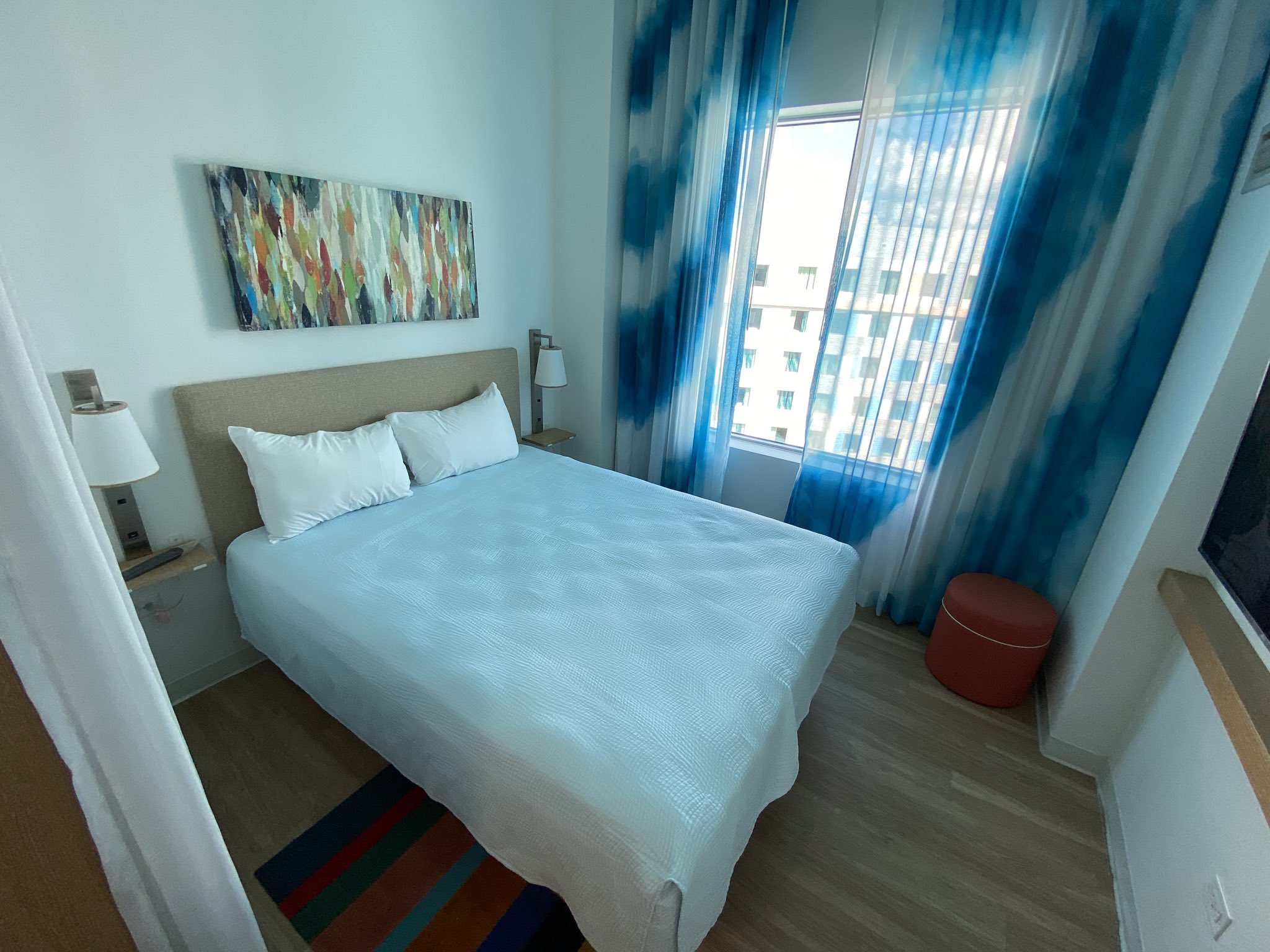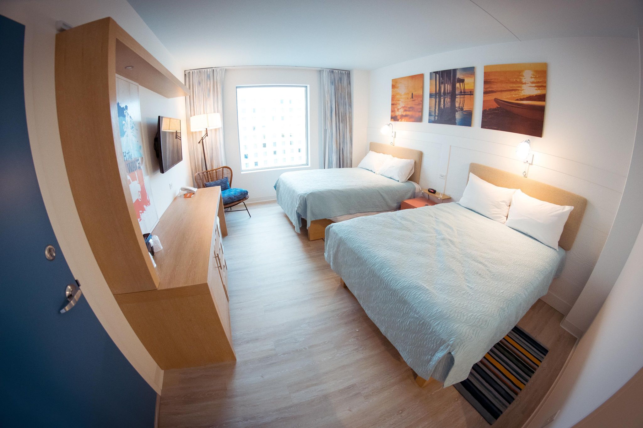Universal’s Endless Summer rooms are similar in offering two queen beds (no Murphy bed option) with a modern TV setup and an actual mini fridge! Unlike at Disney, the sink and vanity area does not have a door to block off the light for mom and dad getting ready in the morning. Universal also makes use of automatic light sensors and switches in the rooms, including requiring placing your keycard in the light switch to turn on the larger lights. We also tend to find the beds are not as comfortable as Disney’s value resorts with thinner pillows and harder mattresses (for my taste).