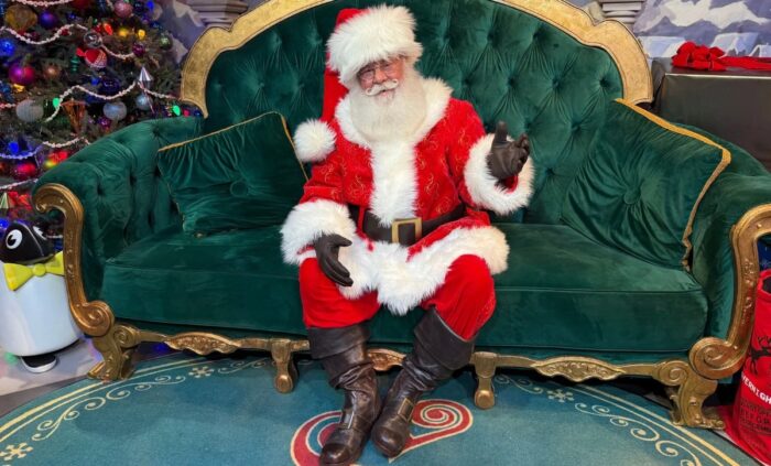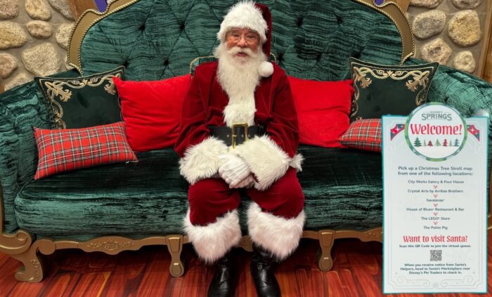 The Disney Springs Santa is located in the Marketplace neighborhood of Disney Springs near Disney Pin Traders. You won’t need a park ticket to visit this Santa, but you will need to join a virtual queue. You can join the virtual queue once you’re on Disney Springs property. There is no standby line at any point so make sure you’ve downloaded the My Disney Experience app before you go. The queue opens at 9:00am, 11:00am, 1:00pm, 3:00pm, and 6:00pm daily through December 24, 2025. There are PhotoPass Photographers present and a limit of 10 guests at a time.