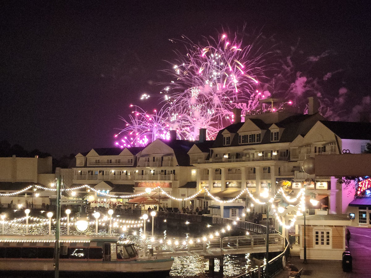 No noticable noise from Boardwalk when doors closed; some foot traffic noise in hall, very nice view, able to observe some performers on Boardwalk at night. Good view for fireworks at Epcot.