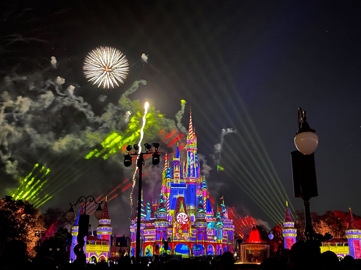 Enchantment’s fireworks can be enjoyed from outside the park, but with the projections so tightly integrated into the performance, be aware that you’ll miss a substantial portion of the show if you’re not viewing from the Main Street area inside the Magic Kingdom.